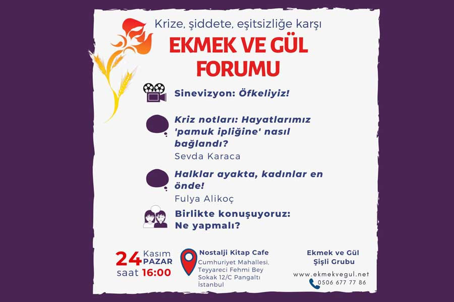 25 Kasım Kadına Yönelik Şiddete Karşı Uluslararası Mücadele ve Dayanışma Günü dolayısıyla Şişli Ekmek ve Gül Grubunun çağrıcısı olduğu “Krize, şiddete, eşitsizliğe karşı Ekmek ve Gül Forumu” düzenlenecek. 24 Kasım Pazar günü saat 16:00’da düzenlenecek olan forumda konuşmacılar Ekmek ve Gül editörlerinden Sevda Karaca ve Fulya Alikoç olacak. 25 Kasım sinevizyonunun ardından “Kriz notları: Hayatlarımız ‘pamuk ipliğine’ nasıl bağlandı?” başlıklı sunum yapacak olan Sevda Karaca, kadınların hayatını pamuk ipliğine bağlayan politikaları, krizin kadınlara yansıması, kriz ve şiddet ilişkisini kadınların anlatımlarıyla örneklendirerek aktaracak.