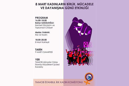 8 Mart Kadınların Birlik Mücadele ve Dayanışma Günü etkinlikleri kapsamında TMMOB İstanbul İKK Kadın Komisyonu 8 Mart söyleşisi ve kokteyli düzenliyor.