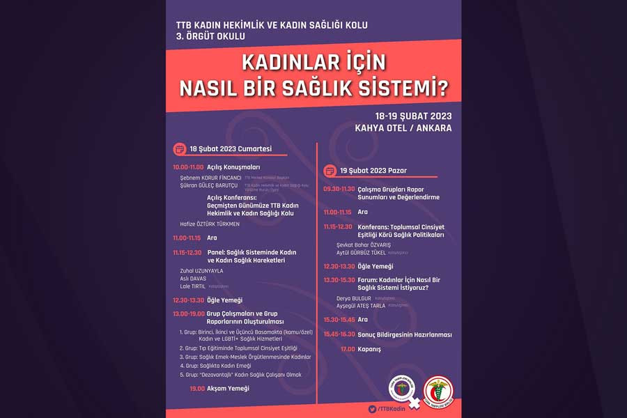 Türk Tabipleri Birliği (TTB) Kadın Hekimlik ve Kadın Sağlığı Kolu 18-19 Şubat 2023 tarihlerinde Ankara’da 3. Kol Örgüt Okulunda, sağlık hizmetini veren, alan tüm kadınlar perspektifinden, kadınların yaşamını, sağlık hakkını ve sorunlarını konuşuyor.