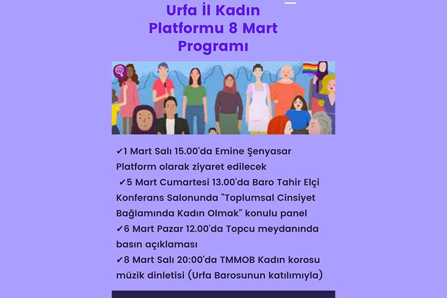 5 Mart Cumartesi, saat 13.00, Urfa Barosu Tahir Elçi Konferans Salonu'nda "Toplumsal Cinsiyet Bağlamında Kadın Olmak" paneli