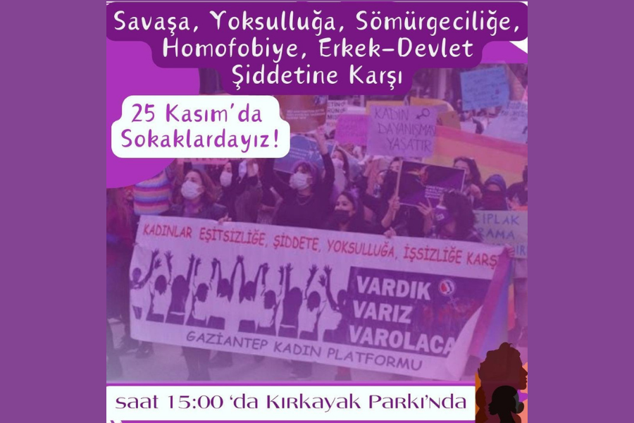 Gaziantep Kadın Platformu 25 Kasım günü, "Savaşa, yoksulluğa, sömürgeciliğe, homofobiye, erkek devlet şiddetine şiddetine karşı" sokakta olacak.