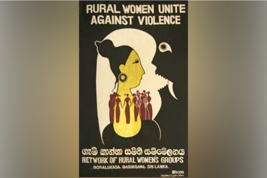 Bu da en eski şiddet karşıtı afişlerden biri. Sri Lanka’da Köylü Kadınlar Grupları Ağı/ Baddegama olarak bilinen bir kadın dayanışma grubu 1970’lerin başında bu afişle kadınları şiddete karşı birlikte hareket etmeye çağırmış.