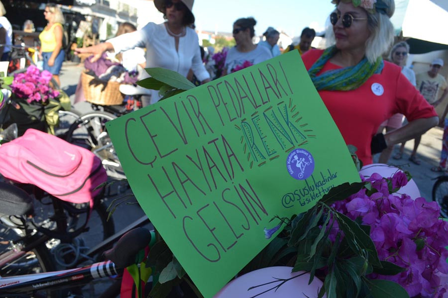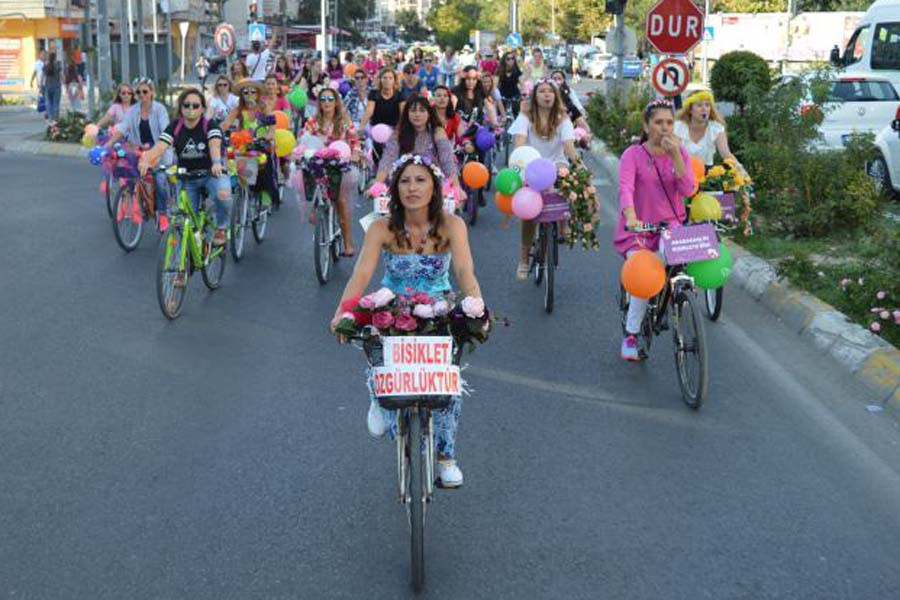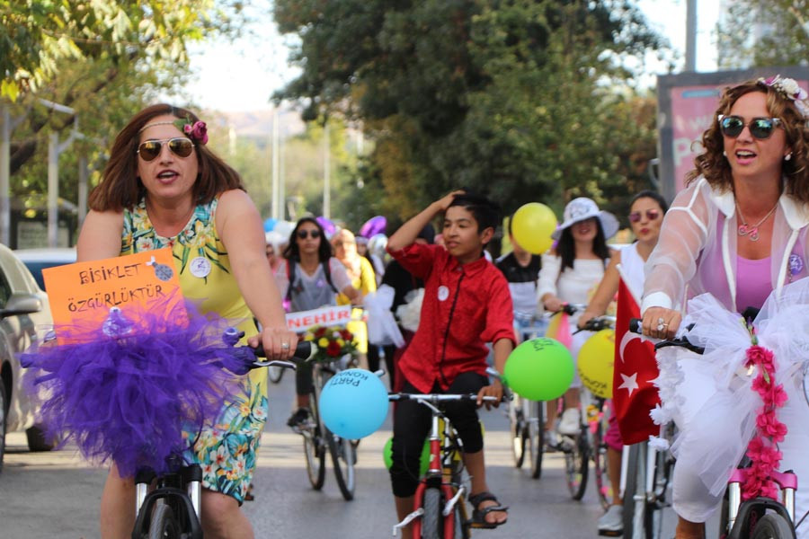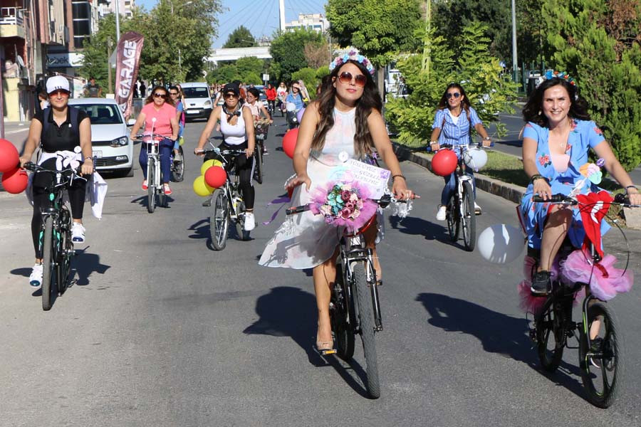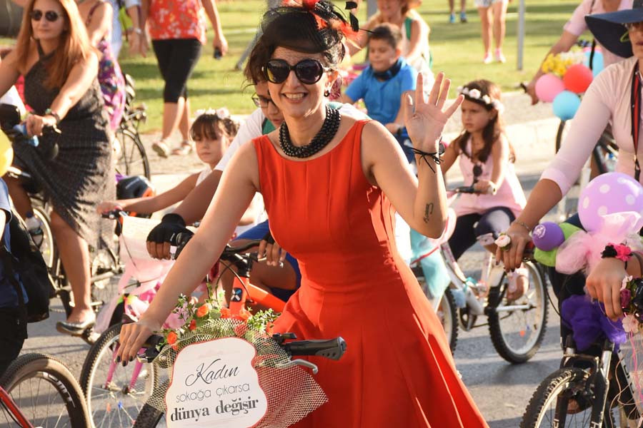 “Topuklu ayakkabılarımızla, rengarenk elbiselerimizle bisiklete biniyoruz. Bisiklete saygı, kadına saygı, kadın bisikletliye saygı istiyoruz” diyen Süslü Kadınlar caddeleri doldurdu.