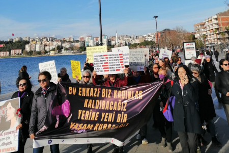 Çanakkaleli kadınların 8 Mart yürüyüşüne deprem nedeniyle göç eden kadınlar da katıldı. Hükümet politikalarını eleştiren kadınlar, dayanışmaya devam edeceklerini vurguladı.