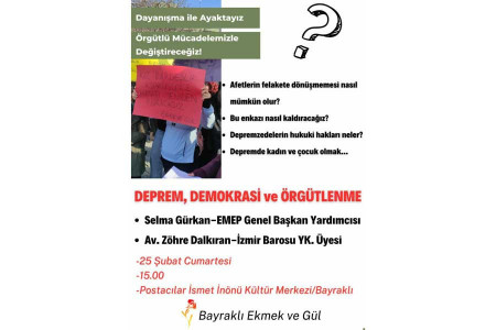 Bayraklı Ekmek ve Gül Grubu Emek Partisi Genel Başkan Yardımcısı Selma Gürkan ve Avukat Zöhre Dalkıran’ın katılımıyla, ‘Deprem, Demokrasi ve Örgütlenme’ paneli düzenliyor.