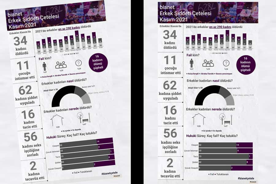 2021’in ilk on bir ayında erkekler, 290 kadını öldürdü, 412 kadını taciz etti, 171 çocuğu istismar etti, 89 kadına tecavüz etti. 2021’in ilk on ayında 199 kadının ölümü basına “şüpheli” olarak yansırken, erkekler, en az 30 çocuğu öldürdü.