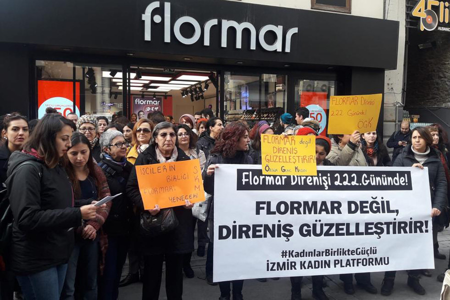 İzmir Kadın Platformunun çağrısıyla Alsancak’ta bulunan Flormar önünde eylem yapan kadınlar da “Tüm işçiler işlerine sendikalı olarak ve tüm haklarıyla iade edilene dek dayanışmayı sürdüreceğiz” dedi.