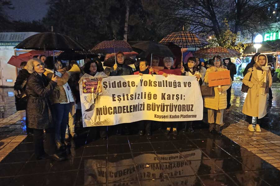 25 Kasım Kadına Yönelik Şiddete Karşı Uluslararası Mücadele ve Dayanışma Günü’nde Kayserili kadınlar, yoğun sağanak yağışa rağmen Cumhuriyet Meydanı’nda bir araya geldi.