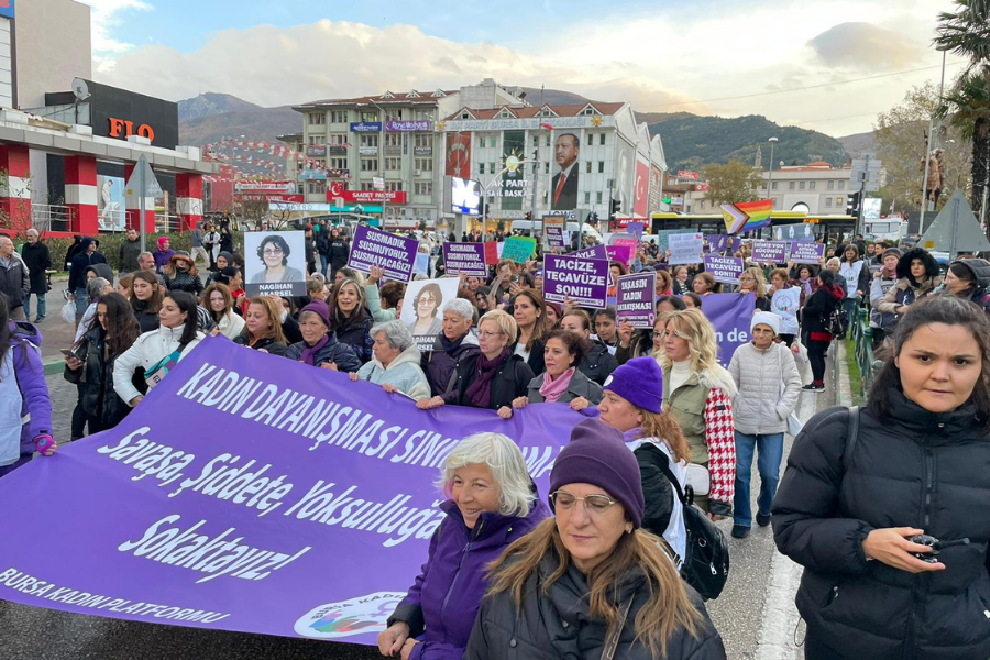 25 Kasım'da Türkiye'nin dört bir yanından kadınlar sokaklardaydı. Bursa Kadın Platformunun çağrısıyla bir araya gelen kadınlar Fomara Meydanı’ndan Kent Meydanı’na yürüdü ve basın açıklaması gerçekleştirdi. Kadınlar yürüyüşte "Yaşasın kadın dayanışması!" ve "Savaşa hayır, barış hemen şimdi!" sloganlarını sıklıkla attı.