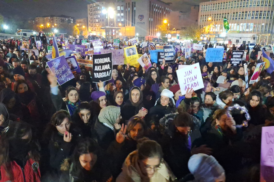 Özgür Kadın Hareketi (TJA), Dicle Amed Kadın Platformu (DAKAP) ve Diyarbakır Şiddetle Mücadele Ağı bileşenleri öncülüğünde 25 Kasım Kadına Yönelik Şiddete Karşı Mücadele ve Uluslararası Dayanışma Günü kapsamında Dağkapı Meydanı’nda bir araya gelen kadınlar Keçi Burcu’na yürüdü. Katledilen kadınların fotoğraflarının yer aldığı dövizler taşıyan kadınlar “Erkek, devlet şiddetine karşı jin, jiyan, azadî” pankartı açarken “Jin, jiyan, azadî”, “Bijî berxwedana jinan” sloganları attı.