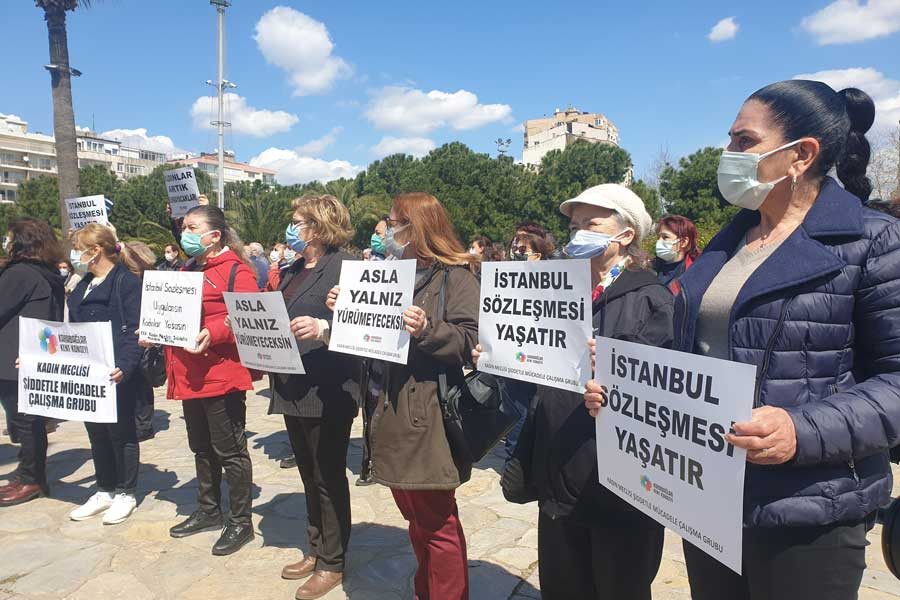 Ardından konuşan İzmir Kent Konseyi Başkanı Nazik Işık da, sözleşmeden çekilmenin hukuksuzluğuna değindi. Işık, “Ben yaptım oldu cumhuriyetinde yaşamıyoruz. Buna karşı kadın, erkek hepimiz İstanbul Sözleşmesi’ni yaşatacağız” diyerek, mücadele mesajı verdi.