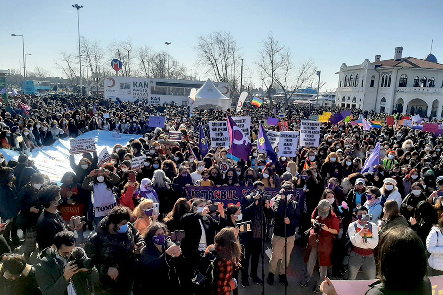 “İstanbul Sözleşmesi’nden vazgeçmiyoruz” diyen kadınlar, Kadıköy’ün ara sokaklarında toplanarak Rıhtım'a yürüdü. Çok sayıda polisin konuşlandığı Rıhtım'da, kadınların ses sistemi kullanmasına müsade edilmedi. Ses sistemini alana sokmak isteyen kadınlara polis biber gazı ile müdahale etti. Polis ile kadınlar arasında çıkan arbedede kadınlar barikatları yıkarak alana girdi. Kadınlara koridor açan polis barikatı kaldırmak zorunda kaldı.
