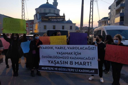 İstanbul Güzeltepe Mahallesinde bir araya gelen Nurtepe ve Güzeltepeli kadınlar 8 Mart açıklaması yaparak ‘Varız, vardık, varolacağız. Yaşaşın 8 Mart’ pankart açtı.