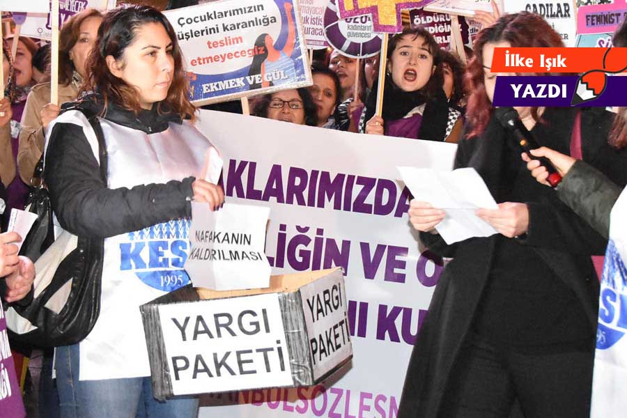 Pek çok farklı yasaya dair değişikliklerin yapıldığı, bir torba halinde bu değişikliklerin toplandığı yargı paketlerine siyasal iktidar büyük reformlar diyor ve paketler ülkenin demokratikleşmesi açısından atılmış önemli adımlar olarak kamuoyuna sunuluyor. Ancak bir süredir bu paketler memlekete bir fayda getirmediği gibi kadınlar için ciddi tehlikeler barındırıyor. 6. Yargı paketi görünen o ki en tehlikeli olanlarından. Gazete haberlerinden, AKP kulislerinden sızan bilgilerle yapılmış yorumlardan, Adalet Bakanı’nın ve Cumhurbaşkanı’nın pakete dair yapmış olduğu genel açıklamalardan bir şeyler çıkarmaya çalışıyoruz. Ocak ayında Meclise gelmesi beklenen son derece yakın bir tehlike, söz konusu olan. İçinde artık neredeyse emin olduğumuz nafaka hakkının gasbı, boşanmaya dair düzenlemeler ve aile arabuluculuğu var. Yıllardır konuşulan, tartışılan, gündemde tutulan, yasal düzenleme yapmak üzere fırsat kollanan bu iki kritik konu artık kapımızda görünen o ki.