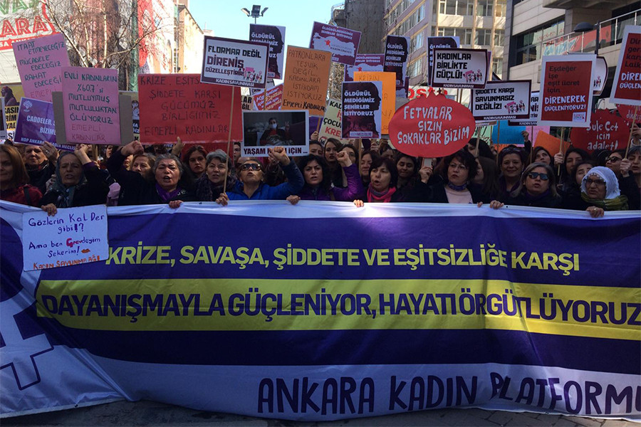 Ankara’da kadınların buluşma noktası Sakarya Caddesi oldu. Ankara Kadın Platformu, 8 Mart çağrısını bu yıl “Krize, Savaşa, Şiddete ve Eşitsizliğe Karşı Dayanışmayla Güçleniyor, Hayatı Örgütlüyoruz!” şiarıyla gerçekleştirdi.