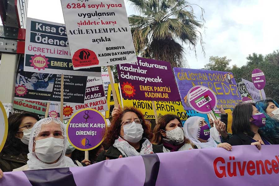 Basın açıklamasında ayrıca pandemi sürecinde kadınların yaşadıklarına dikkat çekilerek şu ifadelere yer verildi: “Ucuz iş gücü olarak görülen, emeği sömürülen, kamusal alanda mobbinge uğrayan, ev içi emeği görülmeyen kadınlar pandemi süreci ile birlikte işsizliği, yoksulluğu en ağır şekilde yaşayan kesimlerin başında gelmektedir. Pandemi sürecinde işten atılmaları güya yasaklayanlar, Kod 29 adı altında birçok işçi emekçi kadının cinsiyetçi uygulamalar sonucu işten çıkarılmasına neden olmuştur. Yine ev içi emeği görülmeyen kadınlar; işsizliğin, yoksulluğun bir yansıması olan erkek şiddetiyle baş başa bırakılmaktadır. Şiddeti doğuran koşulların sorumlusu olan bu iktidar biat etmeyi, makbul kadın olmayı dayatmaktadır.”