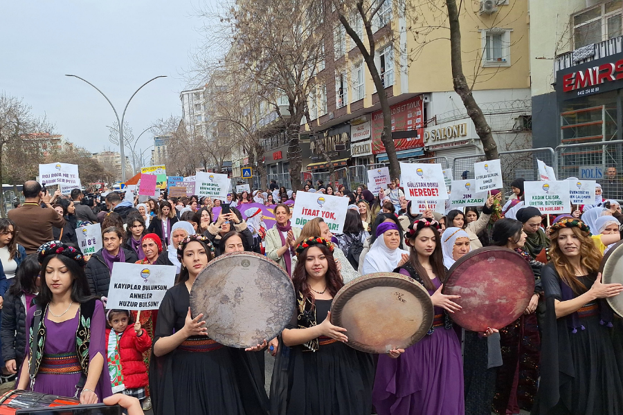 Diyarbakır'da yüzlerce kadın 8 Mart Dünya Emekçi Kadınlar Günü için İstasyon Meydanı’nda toplandı. Dicle Amed Kadın Platformu (DAKAP) ve Özgür Kadın Hareketinin (Tevgera Jinên Azad-TJA) "Kadın kırımına isyan ediyor özgürlüğe yürüyoruz" şiarıyla Ofis'te bir araya gelen kadınlar İstasyon Meydanı’na yürüdü. Kadınlar "Jin jiyan azadî" yazılı bir pankart ile yürürken kadın erbane ekibi kortejin en önünde erbane çaldı. Kadınlar sık sık "Jin, jiyan, azadî" sloganları attı.