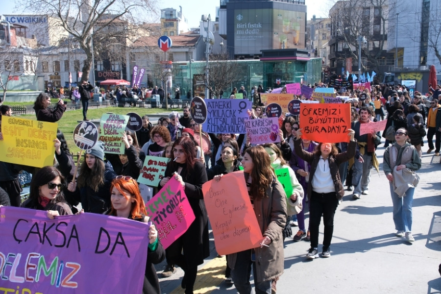 "Bugün, dünyanın dört bir yanında kadınlar eşit, özgür bir yaşam için meydanlarda, Emeğimizin, bedenimizin, hayatlarımızın bizim olduğunu haykırıyoruz. Ülkede her geçen gün artan baskılara, eşitsizliklere ve şiddete karşı ses çıkarıyoruz" diyen kadınlar İstanbul Sözleşmesi'nden, nafaka ve kürtaj hakkından vazgeçmediklerini ve haklarını savunmaya devam ettiklerini vurguladı.