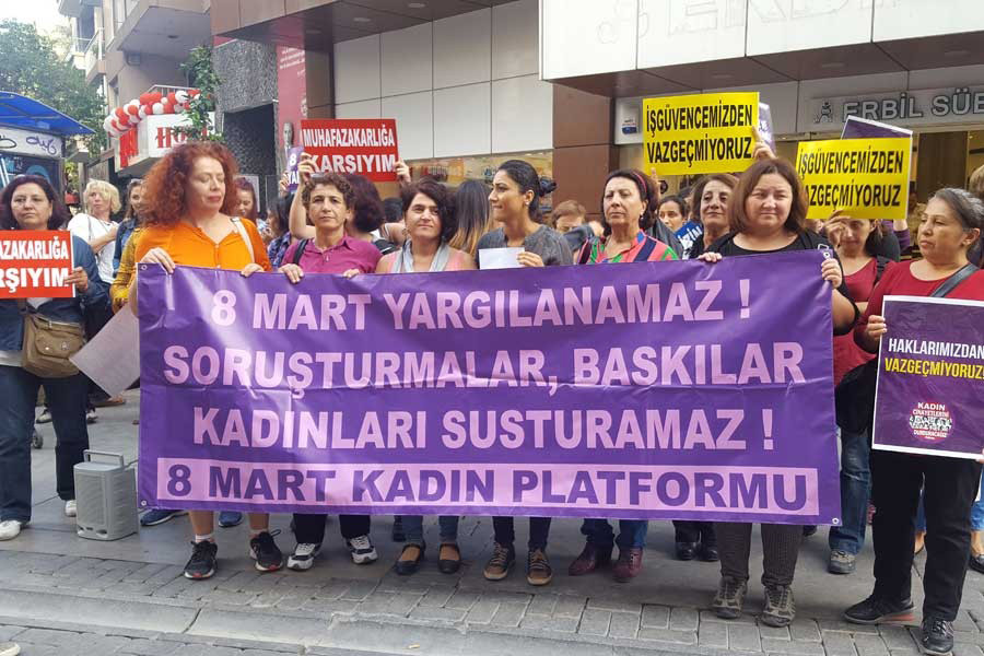 İzmir’de düzenlenen 8 Mart Dünya Emekçi Kadınlar günü mitinginde Eğitim Sen eski Kadın Sekreteri Ayşegül Kocaaslan’ın yaptığı konuşma ve Özlem Gündüz’ün ise taşıdığı döviz gerekçe gösterilerek ‘örgüt propagandası’ iddiasıyla açılan davanın yedinci duruşması görüldü. Duruşma mahkeme heyetinin değişmesi nedeniyle ertelendi.