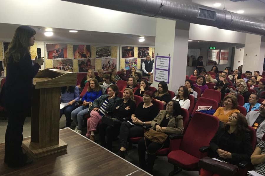 Etkinlikte açılış konuşmasını yapan Neriman Yaldız, “1857’de New York tekstil fabrikasında yanarak yaşamını yitiren 129 kadın işçinin mücadelesinden öğreneceğimiz çok şey var. Biz de mücadele ederek bir araya gelerek haklarımızı kazanabiliriz” diye konuştu.