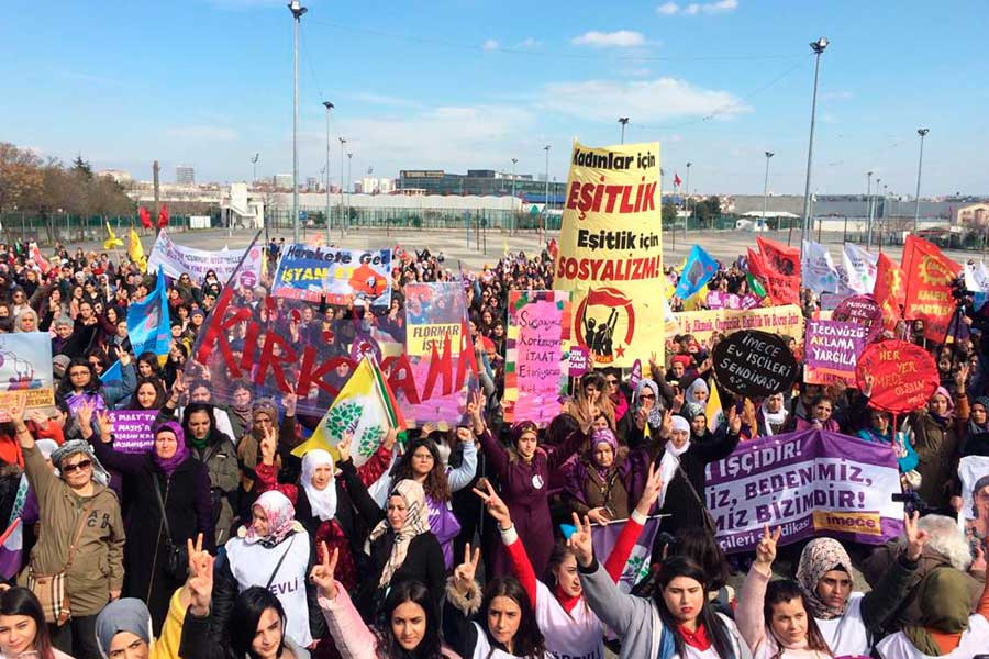 Ve 8 Mart elbette Polonya’da olduğu gibi kürtaj hakkımız için tekrar mücadele ettiğimiz, Arjantin’de, Peru’da, Türkiye’de şiddete karşı sokağa döküldüğümüz, İtalya’da, Güney Kore ve İrlanda’da olduğu gibi üreme sağlığı ve haklarımız için yürüdüğümüz, Doğu Hindistan’da olduğu gibi, tarım işçisi kadınlar olarak toprak ve yaşam ücreti için mücadeleyi tecavüz ve cinsel tacizin son bulması talebiyle birlikte yükselttiğimiz bir içerikte; yani kadınların ezilmesinin, emeğiyle ve bedeniyle sömürülmesinin, tümüyle eşitsiz koşullara mahkum edilmesinin tüm deneyim ve görünümlerine karşı gücümüzü birleştirdiğimiz bir gündür.