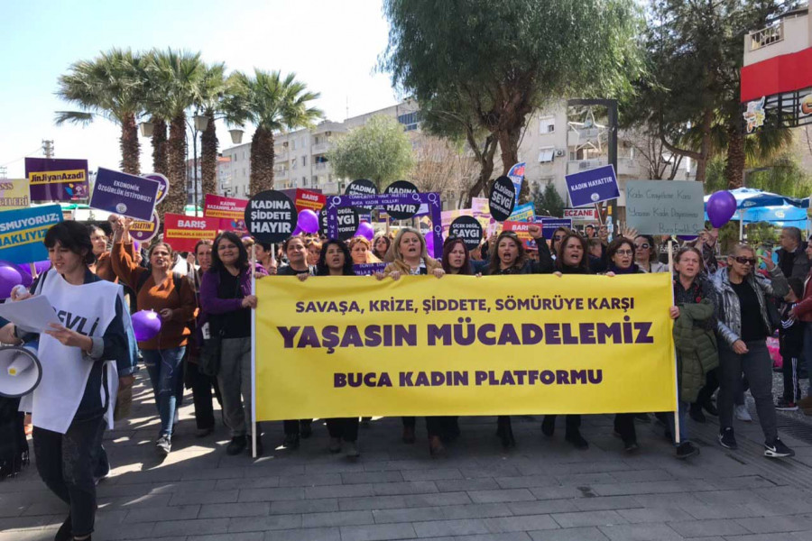 Buca Forbes Madenci heykeli önünde toplanan kadınlar “savaşa, şiddete, krize ve sömürüye karşı yaşasın mücadelemiz” diyerek Şirinyer Migros önüne yürüyüş gerçekleştirdi. Yürüyüşte sık sık “kadınlar savaş istemiyor”, “krizin yükü patronlara”, “yaşasın 8 Mart yaşasın kadın dayanışması” sloganları atıldı. Yapılan basın açıklamasını, Buca Kadın Platformu adına Melike Aktan okudu. Aktan, AKP iktidarının kadın hareketinin yasal ve fiili kazanımları ortadan kaldırmaya dönük hamleler yaptığını söyleyerek, “Ama biz kadınların yaşama hakkımızdan vazgeçmeyeceğiz. Emine Bulut’un çocuğunun gözü önünde katledilirken haykırdığı sözler hepimizin isyanı oldu ölmek istemiyoruz” dedi.‘SÖMÜRÜYE KARŞI EMEĞİMİZE SAHİP ÇIKIYORUZ’