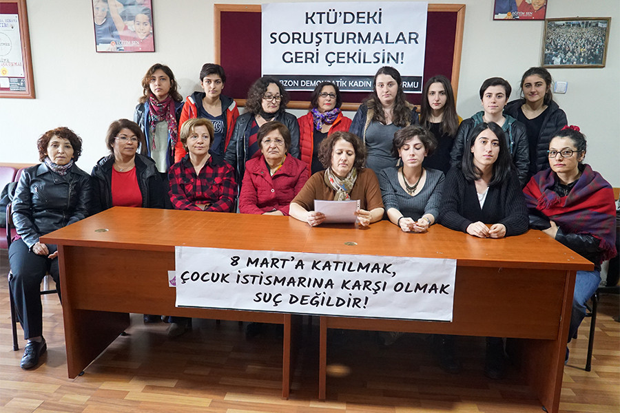 23 üniversite öğrencisi hakkında 8 Mart ve çocuk istismarına karşı eylemleri nedeniyle Karadeniz Tenkin Üniversitesi Rektörlüğü tarafından soruşturma başlatıldı. Soruşturmaya tepki gösteren kadın öğrenciler, ‘‘Her yıl dünyanın dört bir yanında 8 Mart’ta evlerden, sokaklara,kampüslere seslerini taşıyan kadınlara karşı KTÜ Rektörlüğü tarafından bir ilk gerçekleştirilmiştir. Geçtiğimiz hafta KTÜ Rektörlüğü tarafından 23 üniversiteli kadına 8 Mart günü yürüyüşe katılmaktan ve 14 Mart günü Mor Noktada bulunmaktan kaynaklı soruşturma açılmıştır.Şimdi buradan KTÜ rektörlüğüne sormak istiyoruz: Dünyanın dört bir yanında ve ülkemizde suç sayılmayan 8 Mart etkinlikleri KTÜ’de ne zamandır suç sayılmaya başlandı ? Peki üniversite içerisinde gerçekleştirilecek olan eylemlerin yasak olduğuna ya da izin alınmasına gerek olduğu kararı neden üniversite öğrencileri ile şimdiye kadar paylaşılmadı? Kadınların bir araya gelmesini, yaşamlarını savunmasını ve özgürlük istemesini neden yasaklamaya çalışıyorsunuz? Kadınların bir araya gelerek var etmeye çalıştığı alanları neden yok etmeye çalışılıyor?’’ sorularını yöneltti.
