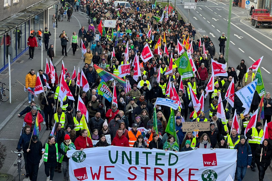 Bu yıl Almanya genelinde farklı işkollarında çalışan toplam 11 milyon işçi ve emekçinin ücret toplu sözleşme görüşmeleri var. Ver.di (Birleşik Hizmet Sendikası) 8 Mart günü Almanya'nın farklı bölgelerinde özellikle kadın işçilerin çalıştığı alanlarda uyarı grevi çağrısı yaptı.