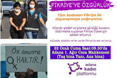 Adana Kadın Platformu 'Fikriye'ye özgürlük' demek için tüm kadınları 22 Ocak Cuma günü saat 9.30'da Adana Adliyesi'ne çağırıyor.