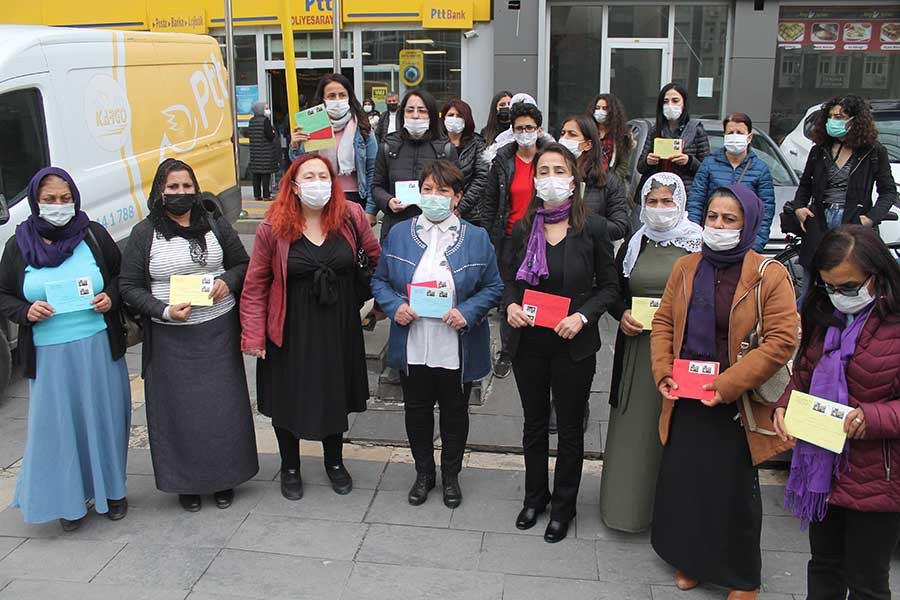 Kart atmadan önce Adana Adliye Sarayı PTT Şubesi önünde basın açıklaması yapan kadınlar şiddet karşısında daha fazla eşitlik ve güvence için mücadele edeceklerini söyledi.