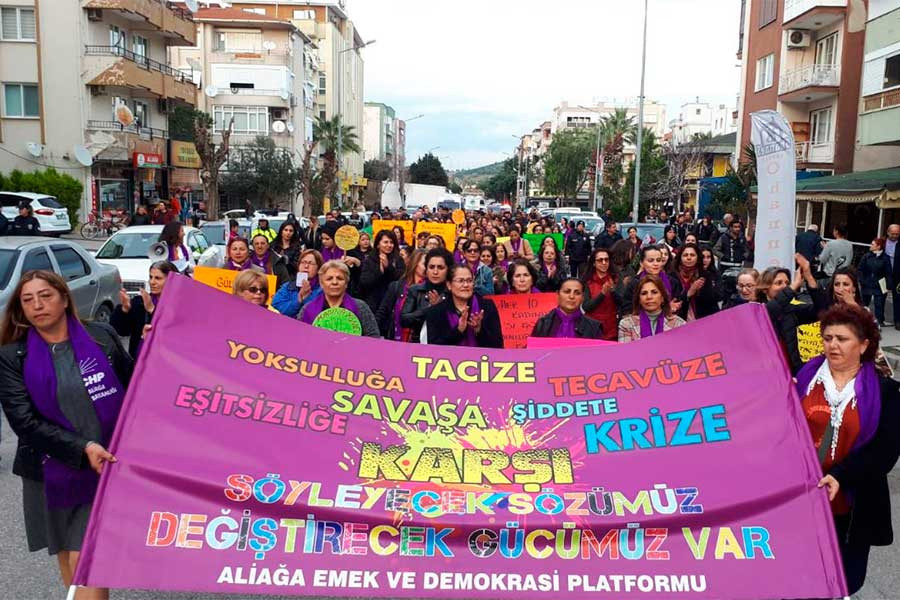 Aliağa’da kadınlar krize, şiddete, savaşa ve eşitsizliğe karşı yürüdü