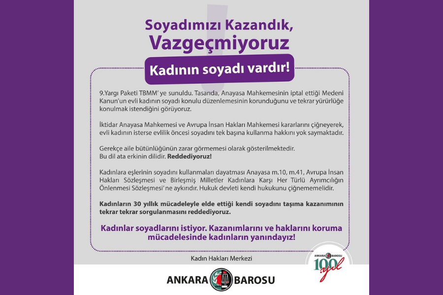 Ankara Barosu Kadın Hakları Merkezi, geçtiğimiz gün Meclis Başkanlığına sunulan 9. Yargı Paketi'nde yer alan soyadı düzenlemesine dair sosyal medya hesabı Instagram'dan bir açıklama yayınladı.