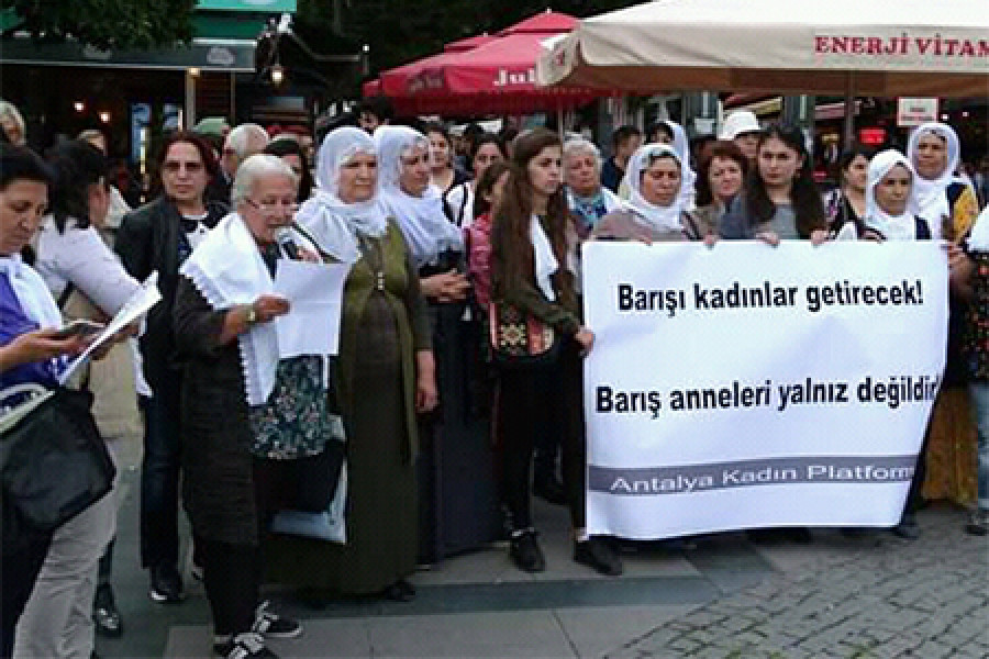 Açlık grevindeki çocuklarına destek olmak için cezaevleri önüne giden ve burada polis şiddetine uğrayan Barış Annelerine Antalya Kadın Platformundan destek geldi. Attolos Heykeli önünde yapılan açıklamada, “Barışı elleriyle getirmek isteyen annelere yönelik şiddetin bir an önce son bulmasını talep ediyoruz. Yaşamı ve barışı hep birlikte örmek istiyoruz” dedi. Açıklamanın tamamı şöyle: