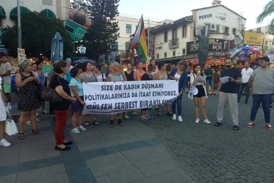 Antalya Kadın Platformu adına açıklama yapan Kadriye Tuğcu, “Gülşen, son birkaç aydır sahnede gökkuşağı bayrağı açması, sahnede giydiği kıyafetler nedeniyle iktidar yanlısı gericiler tarafından linç ediliyordu. Neredeyse her konserinde LGBTİ+’lara verdiği destek, buna dair gerçekleştirdiği performanslar homofobik iktidarın hedefi haline geldi. 25 Ağustos günü nisan ayındaki bir konserinde söylediği sözlerinin, aylar sonra servis edilmesi sonucu tutuklandı. Gülşen’e verilen tutuklama kararı, onun gibi yaşayan yani AKP iktidarının makbul kadın kalıbının dışında kalanlara, itaat etmeyenlere bir gözdağıdır” dedi.