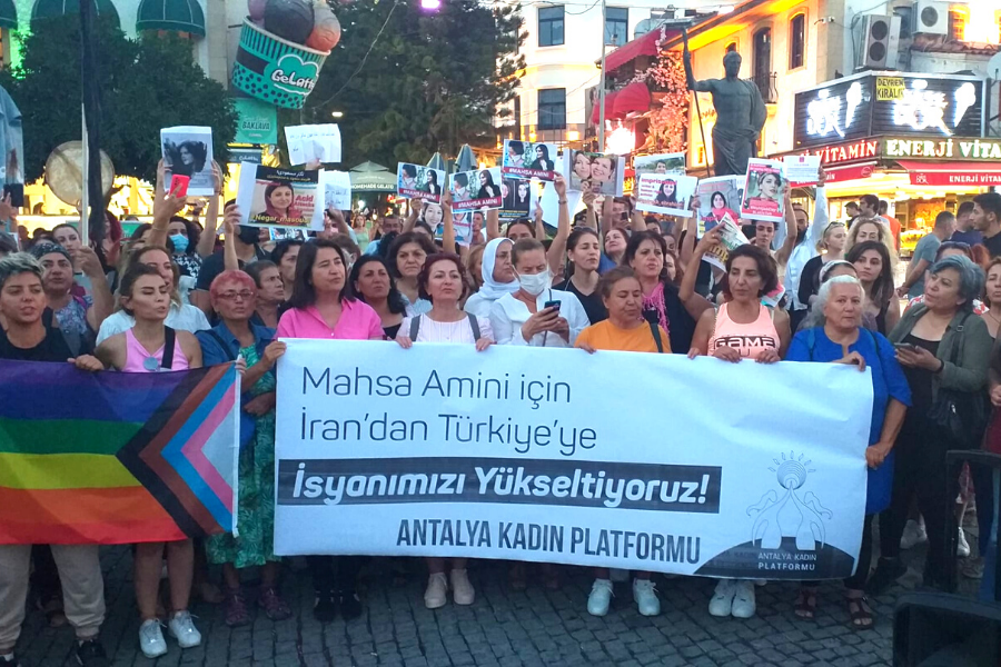Antalya Kadın Platformu İran'da, 22 yaşındaki Mahsa Amini "yasalara uygun örtünmediği" gerekçesiyle ahlak polisi tarafından öldürülmesi üzerine basın açıklaması yaptı.