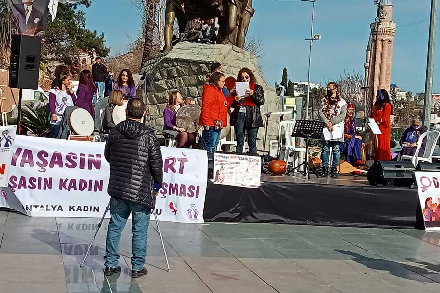 Antalya Kadın Platformunun çağrısıyla Aydın Kanza Parkı’nda buluşan kadınlar alkışlarla, sloganlarla Cumhuriyet Meydanı’na yürüdü. Cumhuriyet Meydanı’nda basın açıklaması yapan kadınlar “Yaşamın her alanında; ayrımcılığa, cinsiyetçiliğe, yoksulluğa, erkek ve devlet şiddetine karşı direnmeye ve örgütlü mücadelemizi büyütmeye devam edeceğiz” dedi.