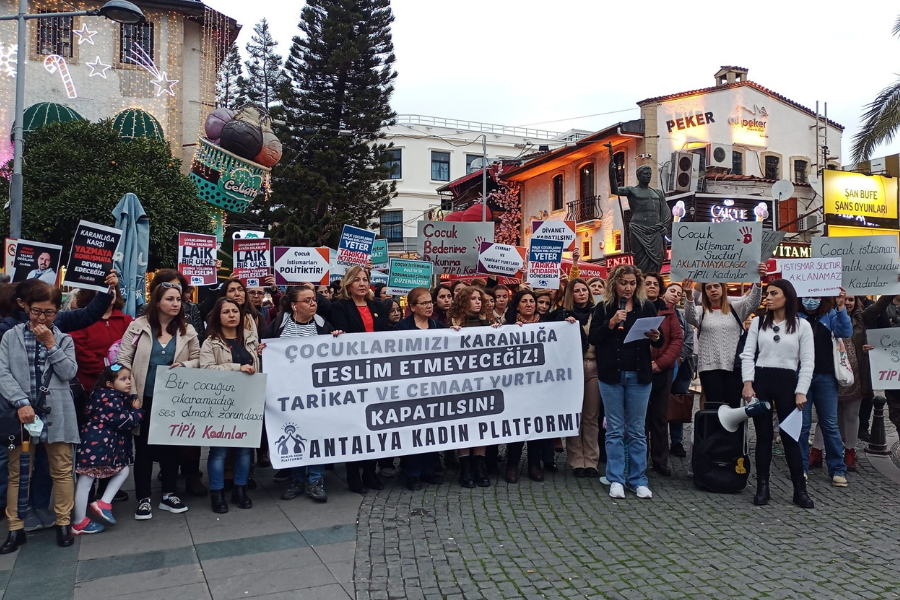İsmailağa Cemaati’ne bağlı Hiranur Vakfı’nın onursal başkanı Yusuf Ziya Gümüşel’in kızının 6 yaşında evlendirilip, istismara maruz bırakılmasına, soruşturmanın kapatılmasına ve ihmallere karşı Antalya Kadın Platformu bugün Attalos Meydanı’nda basın açıklaması düzenledi.