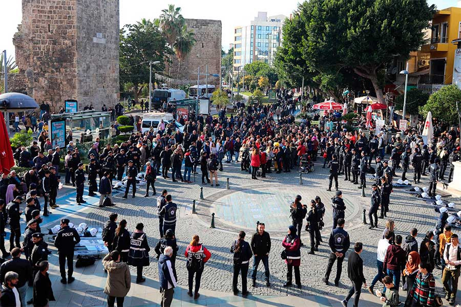 Şili’de kadınların “Kadına Yönelik Şiddete Karşı Uluslararası Mücadele Günü” dolayısıyla hazırladığı “Las Tesis” dansı, dünyanın birçok ülkesinde yankı uyandırmış ancak Türkiye’deki protestoların çoğu polis müdahalesi ile karşılaşmıştı. Antalya Kadın Platformu üyelerinin eylemi de polis tarafından engellendi. Kazım Özalp Caddesi’ndeki Attalos heykeli önünde bir araya gelen yaklaşık 100 kadın, “Yaşamak istiyoruz” yazılı pankart açarak dans etmek istedi. Polis, eyleme “dans sırasında söylenecek sözlerin içeriği” bahane ederek izin vermedi. Çevik kuvvet polisleri, kadınları çember içine alarak bekledi.