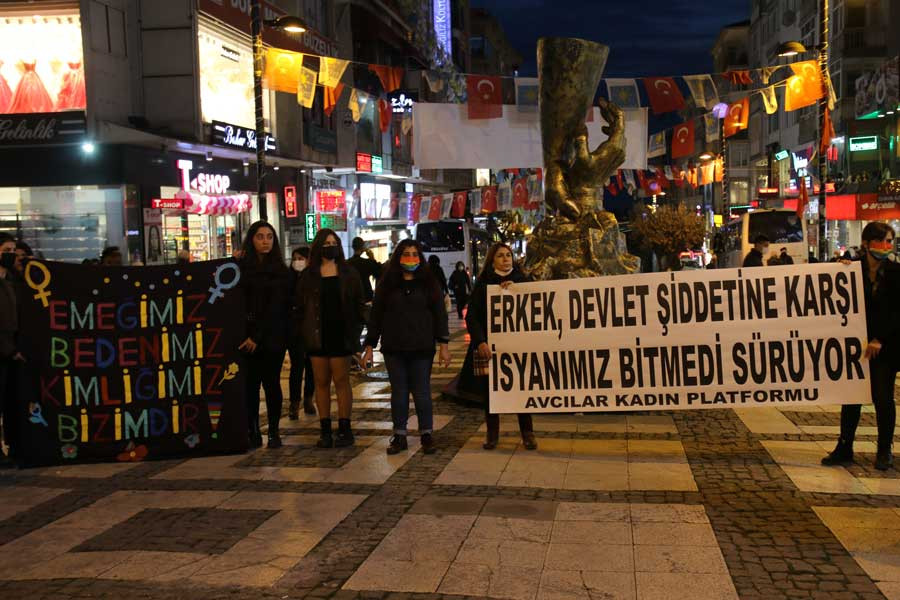 Avcılar Kadın Platformu, 25 Kasım Kadına Yönelik Şiddetle Uluslararası Mücadele Günü nedeniyle Avcılar Deprem Anıtı önünde bir araya geldi. “Şiddet düzenine itirazımız var” şiarıyla basın açıklaması yapan kadınlar, “Erkek şiddetine karşı isyanımız bitmedi sürüyor”, “Emeğimiz, bedenimiz, kimliğimiz, bizimdir” pankartı açtı. Açıklama öncesi İstanbul Sözleşmesi ve kadına yönelik şiddeti anlatan tiyatral gösterim yapan kadınlar, “ İstanbul sözleşmesi bizim, vazgeçmiyoruz”, “Kadınlar birlikte güçlü” sloganları atarak zılgıt çekti.