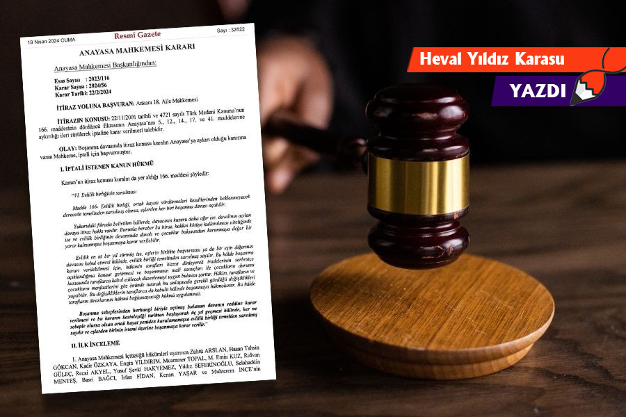 Geçtiğimiz gün Resmi Gazete'de yayınlanan Ankara 18. Aile Mahkemesinin, Medeni Kanun’un 166/4 fıkrasını AYM ye taşıması üzerine AYM geçtiğimiz günlerde başvuruyu inceledi ve bir karar verdi. Karar da; bu madde ile taraflara katlanamayacakları uzun süreli bir külfet yüklendiği, özel hayata ve aile hayatına saygı ile aile kurumunu koruma amacı arasında makul bir denge sağlamayan kuralın ölçülülük ilkesini orantılılık alt ilkesi yönünden ihlal ettiği vurgulandı.