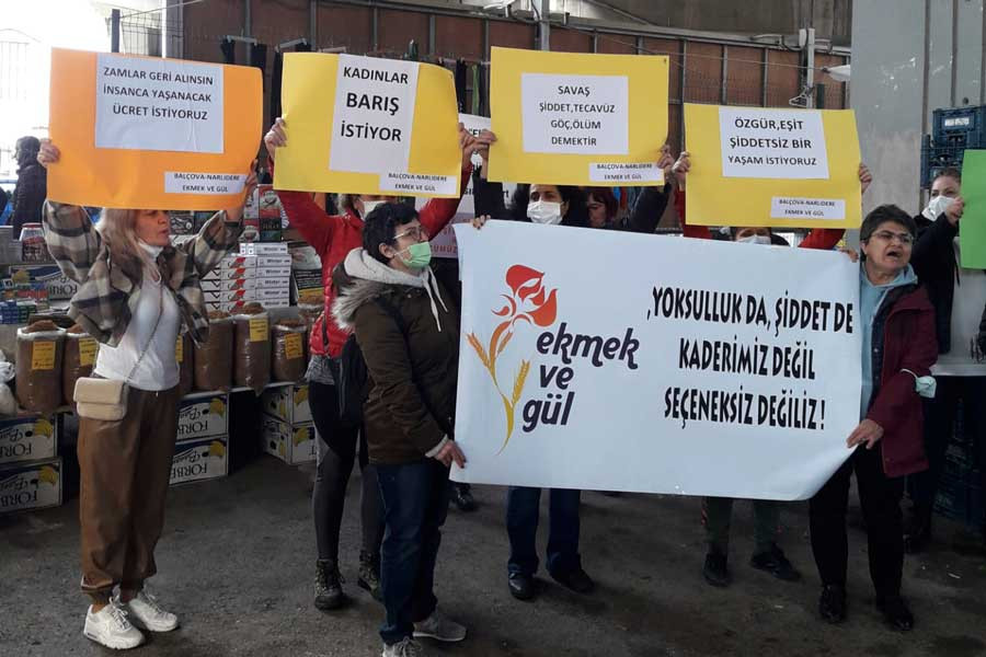 Dün Balçova’da bugün de Üçkuyular ve Narlıdere pazar yerlerinde bir araya gelen Ekmek ve Gül grubundan kadınlar eşit, özgür ve şiddetsiz bir yaşam için, savaşa hayır demek için, kadın cinayetlerine, tacize, tecavüze dur demek için, yapılan zamlar geri alınsın talepleri için kadınları 8 Mart’ta alanlara çıkmaya çağırdı. Kadınlar sloganlarıyla bildirilerini dağıtırken vatandaşlar ve pazar esnafının alkışlarla kadınlara destek verdi. Üçkuyular pazar yerinde Selin Kurşun, Narlıdere’de ise Selver Kopan basın açıklamasını okudu. Bildiri ve basın metninde “Kadınlar kazanacak, biz kazanacağız” diyen kadınlar, yoksulluktan, tarikat baskısına, zamlardan, şiddete yaşanmakta olan tüm baskılara itirazlarını dile getirirken, “Yaşasın 8 Mart, yaşasın kadın dayanışması sloganları attı.”