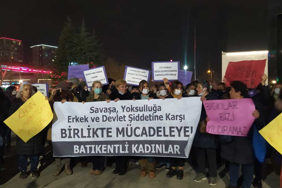 Batıkent Meydan’da yapılan açıklamada konuşan Türkan Akbıyık, Türkiye'de 2021'in ilk 10 ayında en az 326 kadının öldürüldüğünü, ekim ayında ise bilinen 22 kadın cinayeti yaşandığını, 53 kadının şiddete uğradığı için şikâyette bulunduğunu, 9 kadının tecavüze uğradığını, 280 kadın ise taciz edildiğini belirtti. Kadınların artan şiddet karşısında yaşamlarını korumaya çalışırken iktidarın kadınların haklarına yönelik saldırıları yoğunlaştırdığına dikkat çeken Akbıyık, “Kadına yönelik şiddetin böylesi arttığı bir dönemde, iktidar, toplumsal cinsiyet eşitliğini esas alarak kadınların şiddete karşı korunmasının hukuki zeminini sağlayan, Türkiye'nin de ilk imzacısı olduğu İstanbul Sözleşmesi’ni kendisine tehdit görerek tek taraflı feshetti. Kadına yönelik şiddetin münferit değil politik olduğunu biliyoruz! Şiddetin önlenmesi için iktidarların alması gereken sorumluluğun farkındayız! Biz kadınlar her gün daha fazla tehdit altında, her gün daha tedirgin yaşamaya çalışırken bizleri koruyan mekanizmalara göz dikenlerin amacını biliyoruz! Kadınlar şiddet karşısında yalnızlaşmayacak, boyun eğip ‘kader’ diyerek şiddeti kabullenmeyecek, kendine dayatılan hayatla yetinmeyecek. Biz kadınlar ne İstanbul Sözleşmesinden, ne haklarımızdan ne de hayatlarımızdan vazgeçmiyoruz. Ve yine biliyoruz ki eşit, özgür ve şiddetsiz bir yaşam ancak kadınların dayanışması ve örgütlü mücadelesiyle mümkün” dedi.