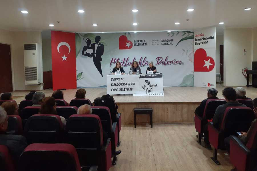 Bayraklı’da Postacılar İsmet İnönü Kültür Merkezi’nde bir araya gelen Ekmek ve Gül okurları “Afetlerin felakete dönüşmemesi nasıl mümkün olur? Bu enkazı nasıl kaldıracağız? Depremzedelerin hukuki hakları neler?” gibi soruların tartışıldığı panelde bir araya geldi. “Deprem, Demokrasi ve Örgütlenme” panelinde ayrıca “Enkaz altında kalmamak için hep birlikte örgütlü mücadele”, “Kız Kardeşlik Köprüsü ile hayatı yeniden kuracağız”, “Dayanışmamızı sürdüreceğiz örgütlü mücadelemizle değiştireceğiz”, “Deprem değil kâr ve rant hırsı öldürür” dövizleri asıldı.