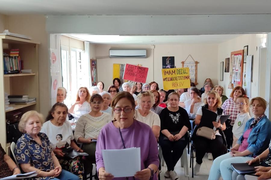 Buca Evka-1 Kadın Kültür ve Dayanışma (BEKEV), okullarda ücretsiz yemek uygulamasının Sağlık Bakanlığı’nın Stratejik Planında yer verilmemesine tepki gösterdi. Ekmek ve Gül’ün çağrısını yaptığı “okullarda her çocuğa bir öğün ücretsiz sağlıklı yemek verilsin” kampanyasını sürdüren BEKEV üyesi kadınlar dernek binalarında bir araya gelerek taleplerinden vazgeçmeyeceklerini söylediler.