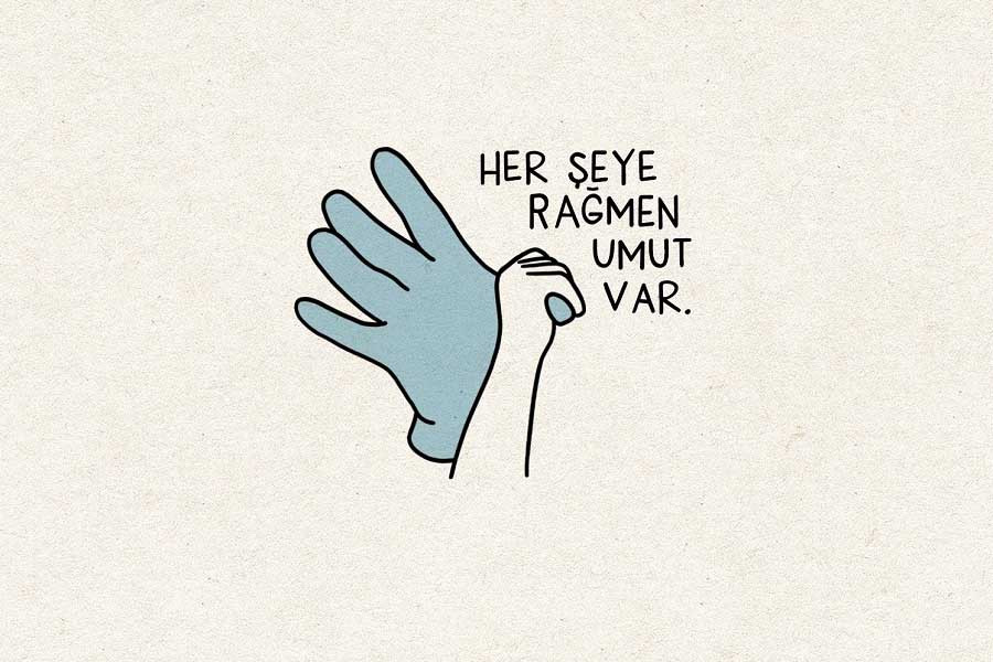 Elif’in minik ellerine uzanan mavi eldivenli el, elinde avucunda ne varsa paylaşmaya uzanan eller bize bir şeyi tekrar tekrar söylüyor aslında: Hayatımızı çevreleyen, bir çember içine alan her türlü zorluğun, felaketin üstünden gelmek için birbirimize el uzatmak zorundayız.