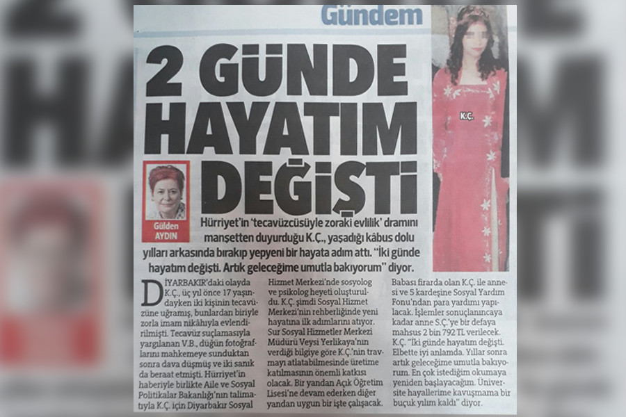 K.Ç. isimli bir kadın bundan 3 yıl önce, 18 yaşındayken Diyarbakır’da iki kişinin tecavüzüne uğramıştı. İki arkadaş olan tecavüzcüler genç kızı defalarca kez tehdit ederek, şantaj yaparak tecavüz etti. Bunun sonu olmadığını fark eden K.Ç. dava açtı ve olay mahkemeye taşındı. Sanıklar 14 yıldan 36 yıla kadar hapisle yargılanıyordu ki tecavüzcülerden biri K.Ç. ile evlendirildi! Dava süresinde 1 ay tutuklu kalan tecavüzcüler serbest bırakıldı, dava da düştü.