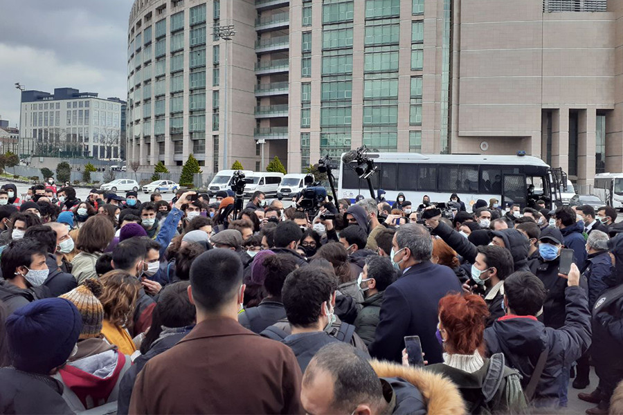 "Bugün burada Boğaziçi Üniversitesi’ne yapılan gayrimeşru rektör atamasını protesto ettikleri için 29 Ocak’ta gözaltına alınan ve sonrasında tutuklu ve tutuksuz yargılanmakta olan 7 öğrencimizin duruşmasına destek vermek için bulunuyoruz. 30 Ocak’tan bu yana 2 öğrencimiz Metris cezaevi’nde tutuklu, 2’si de ev hapsinde olarak özgürlüklerinden mahrum bırakılmış durumdalar. Kamuoyuna öğrencilerimizin yanında olduğumuzu bir defa daha ilan etmek isteriz.