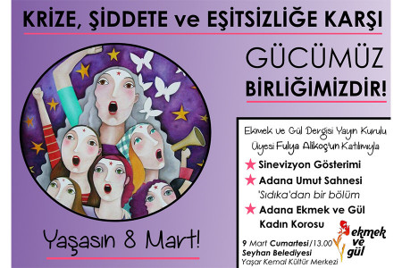 Adana Ekmek ve Gül Grubu 9 Mart Cumartesi Seyhan Belediyesi Yaşar Kemal Kültür Merkezinde yapacağı etkinlikle 8 Mart Dünya Emekçi Kadınlar Günü için kadınlarla bir araya geliyor.