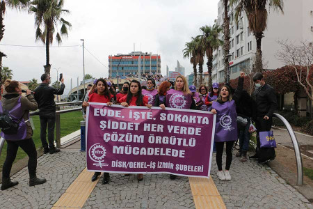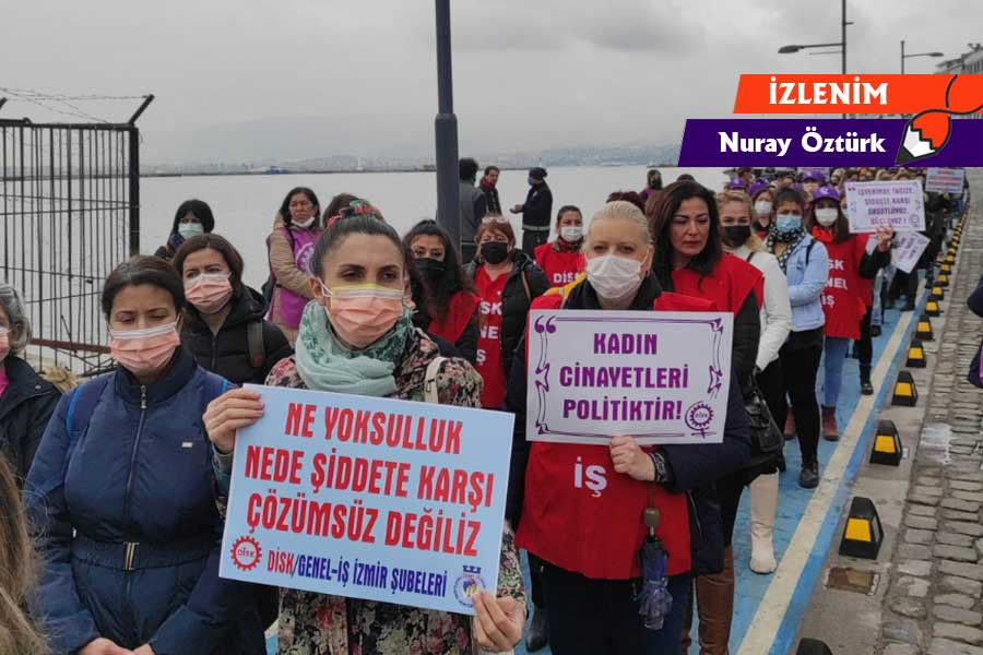Eylemden sonra Genel İş şubelerinin ortaklaşa düzenlediği Konak Pier önünden gerçekleşecek 25 Kasım yürüyüşüne gitmek için otobüslere bindik kadınlarla birlikte. Yolda, neler hissettiklerini sordum kadınlara. “Çok güzel oldu eylem” diyor biri… Diğeri “Kendimi iyi hissetmiyordum, akşam sabaha kadar doların yükselişini konuştuk eşimle. Yorgun, bitkindim, canım çok sıkındı. Gelmeyecektim, son anda vazgeçtim. İyi ki gelmişim” diyor. Bir başkası “Bunlar başımızdayken biz ne yapsak olmaz” diyor sinirle… “Trafiği kapatmak lazım” diyor öbürü, “Onu da 8 Mart’ta yaparız” diyor bir başkası… 8 Mart planı yapmaya başlıyorlar.