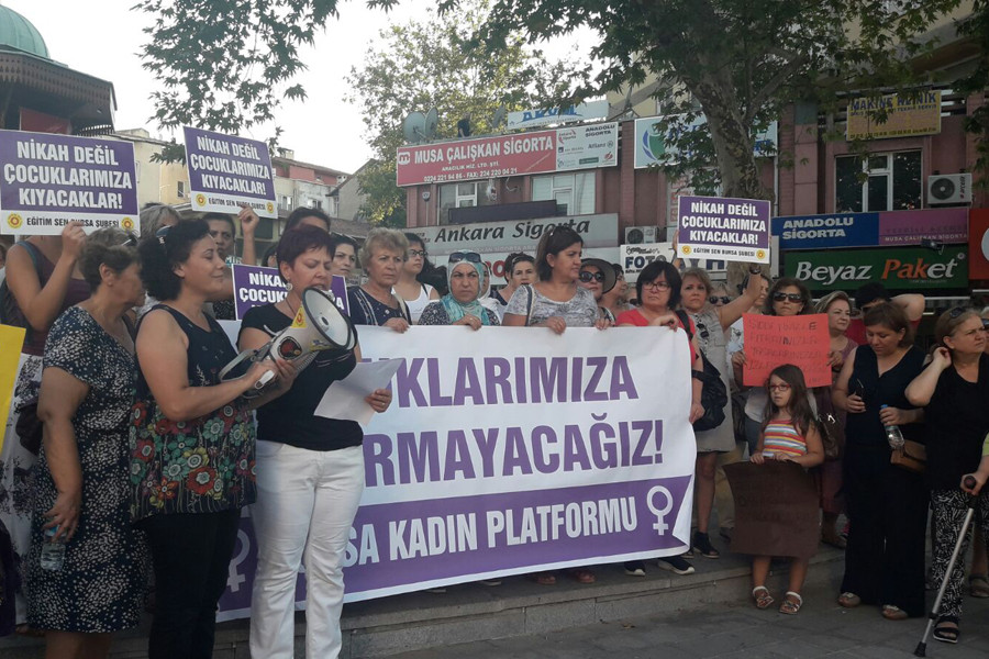 Bursa Kadın Platformu Fomara Meydanı’nda yaptığı açıklamayla müftülere resmi nikah yetkisi veren tasarıya karşı mücadeleyi sürdüreceklerini ifade etti. 2015 yılında Anayasa Mahkemesinin (AYM) resmi nikah kıymadan dini nikah yaptıranlara ve evlilik cüzdanını görmeden bu nikahı kıyan din görevlisine hapis cezası verilmesini öngören TCK maddesinin iptal edildiğini hatırlatan kadınlar, bu tasarıyla da AKP’nin Medeni Kanunu dini bakış açısıyla yeniden düzenlemeye çalıştığını söyledi. Kadınların bu tasarıyla birlikte kaygılandıkları en önemli konu; bu düzenlemenin çocuk evliliklerin önünü açması. Bursalı kadınlar, daha önce pek çok kadının tepki gösterdiği 'çocuk istismarını evlilikle meşrulaştırma yasası'nı hatırlatıyor ve müftülere nikah yetkisi veren tasarıyla daha önce tepki gösterdikleri gündemlerin yeniden önlerine getirildiğini söylüyor.